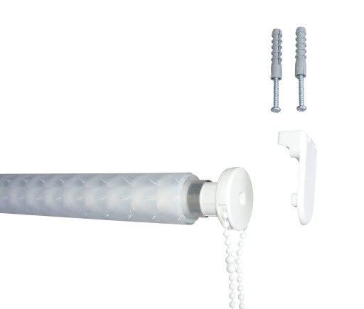Roleta mocowana do sufitu za pomocą plastikowych uchwytów, w komplecie roleta nawinięta na rurę aluminiową, uchwyty do mocowania do sufitu, system opuszczania wraz z hamulcem i łańcuszkiem, kołki montażowe.