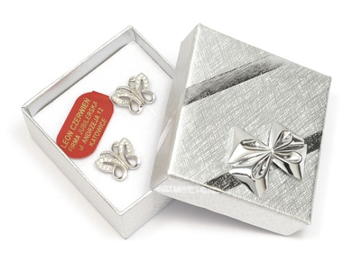 Przedmiotem aukcji jest uroczy srebrny komplet z motylkami: wysadzane cyrkoniami kolczyki oraz wisiorek z łańcuszkiem. Zawieszka, łańcuszek i kolczyki w całości wykonane są z rodowanego srebra. Warstwa twardego, szlachetnego rodu zabezpiecza srebro przed oksydowaniem (ciemnieniem) i rysowaniem się powierzchni.