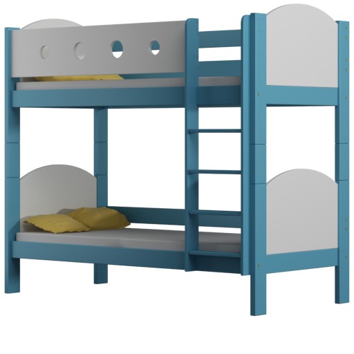 URWISEK L to łóżko piętrowe, które można rozłożyć na dwa niezależne łóżeczka. Wykonane zostało z wysokiej jakości drewna sosnowego, połączonego z wytrzymałą płytą meblową w zagłówkach i górnej barierce. Montowana z prawej, bądź lewej strony łóżka drabinka, posiada płaskie, wygodne szczebelki, natomiast krawędzie drewnianej konstrukcji mają zaokrąglone kształty. Charakterystyczną cechą tego modelu są gładkie, łukowate zagłówki oraz boczna barierka górna, zdobiona wyciętymi kołami.