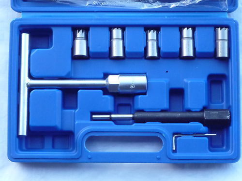 Zestaw do regeneracji gniazd wtryskiwaczy.Po każdorazowej wymianie wtryskiwacza konieczne jest czyszczenie jego gniazda w celu wyeliminowania nagaru, korozji oraz wszelkich zanieczyszczeń. Wykonanie tych czynności powoduje dużą większą ochronę przed uszkodzeniem bloku jak też i wypaleniem gniazda. W naszej ofercie posiadamy zestaw frezów do regeneracji gniazd wtryskiwaczy pasujący do większości samochodów osobowych.W danych technicznych przedstawiamy opis zawartości oferowanego zestawu.