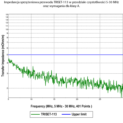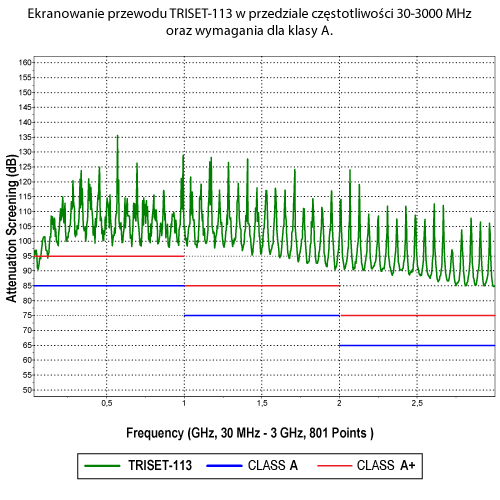 Przewód koncentryczny 75 Om TRISET-113 spełnia normę EN50117 i jest zgodny ze standardem klasy A w całym paśmie transmisyjnym w przedziale częstotliwości 5 - 3000 MHz.