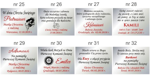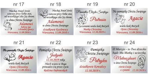 - podaj treść zaznaczoną kolorem czerwonym (tj. imię dziecka, podpis (kto wręcza), datę chrztu, miejscowość - opcjonalnie),