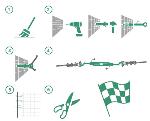 Łatwy montaż przy pomocy specjalnych zaczepów oraz kleju marki Avik bez konieczności wiercenia w elewacji. Zaczepy odpowiedni przykleja się specjalnym klejem do elewacji (nawet "baranka") a następnie wpina do nich siatkę równomiernie ją naciągając.