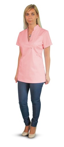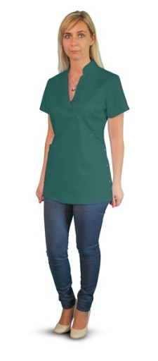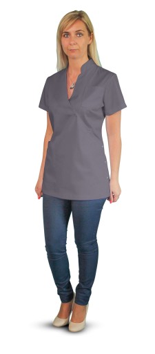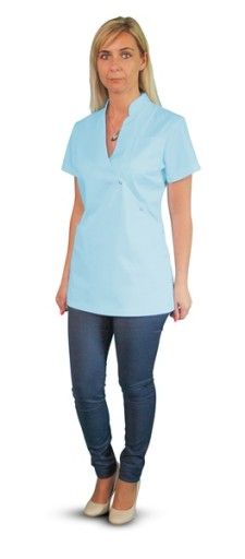 Góra fartucha elegancko wykończona jest stójką. Krótki rękaw sprawia, że fartuch nie ogranicza ruchów i jest bardzo wygodny.
