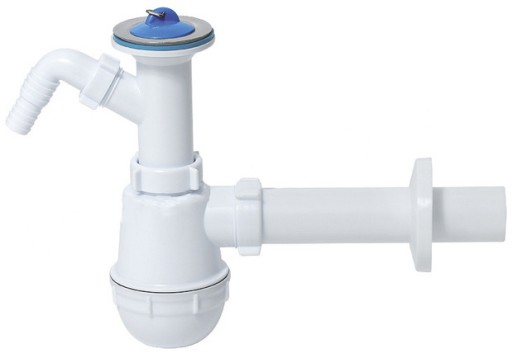 Syfon zlewozmywakowy butelkowy pojedynczy z metalowym sitkiem fi 70mm z wyjściem do pralki/zmywarki
