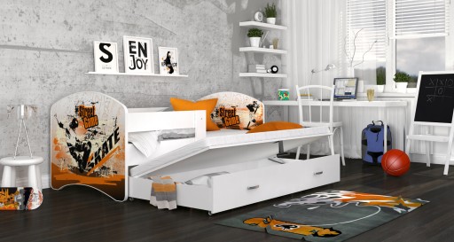 - Pojemna szuflada wysuwana na kółkach, mogąca służyć jako pojemnik na pościel lub zabawki. Szuflada jest oddzielnym elementem łóżka.