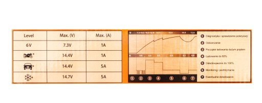 - Ładowarka obsługuje większość dostępnych na rynku akumulatorów samochodowych, żelowych, AGM o pojemnościach 1.2 - 120 Ah. Posiada duży, czytelny wyświetlacz LCD i wbudowany woltomierz, pozwalający na szybką ocenę naładowania podłączonego akumulatora.