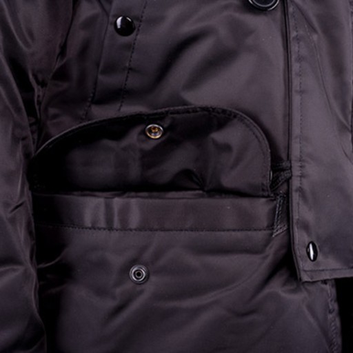 Kurtka zapinana na zamek dodatkowo pokryty patką zapinaną na zatrzask i guziki. Zamek poprowadzony jest od końca wysokiej stójki do 1/4 wysokości kurtki, dzięki czemu zapewniając komfort termiczny nie ogranicza swobody ruchów.
