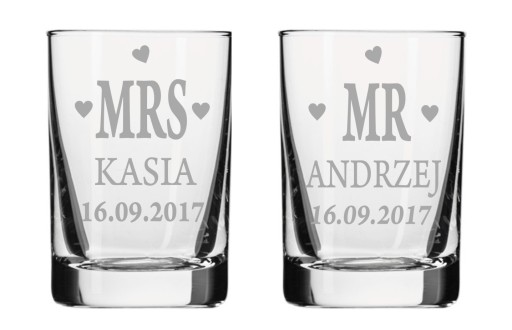Kieliszki mogą być piaskowane w 2 wersjach: całe przezroczyste, nóżka szroniona. Po zakupie należy do nas przesłać: imiona, datę oraz jak ma być piaskowany kieliszek.