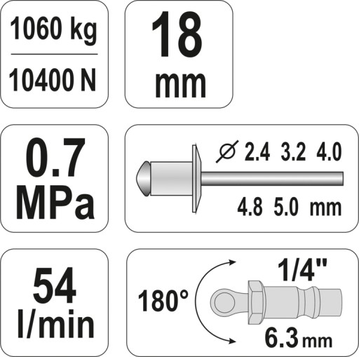 Nitownica pneumatyczny firmy YATO. Nitownica jest dopasowana do nitów: 2,4; 3,2; 4,0; 4,8; 5,0 mm. Skok roboczy wynosi 18 mm.