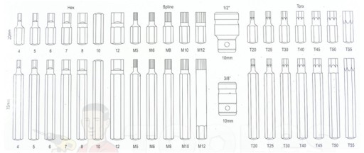 Zestaw bitów, służący do odkręcania śrub specjalnych typu: hex, torx, spline. Różnorodność bitów zapewnia możliwość wykonania wielu prac w specjalistycznych serwisach mechanicznych i samochodowych. Końcówki posiadają dwie długości 30 oraz 75 mm, mocowane w uchwycie sześciokątnym 10 mm, dostosowanym do współpracy z grzechotką 1/2" oraz 3/8".