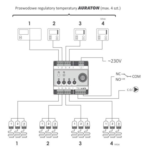 - Do każdej strefy możliwe jest podłączenie do 3 siłowników AURATON TE 230 lub AURATON TE 230PRO.