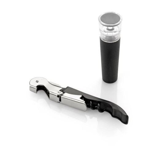 Dwuelementowy, elegancki zestaw do wina zawiera próżniowy korek oraz korkociąg. Próżniowy korek z pompką zasysającą powietrze z butelki pozwala na dłuższe przechowywanie otwartego wina bez utraty cennych aromatów. Zestaw jest zapakowany w eleganckie czarne pudełko.