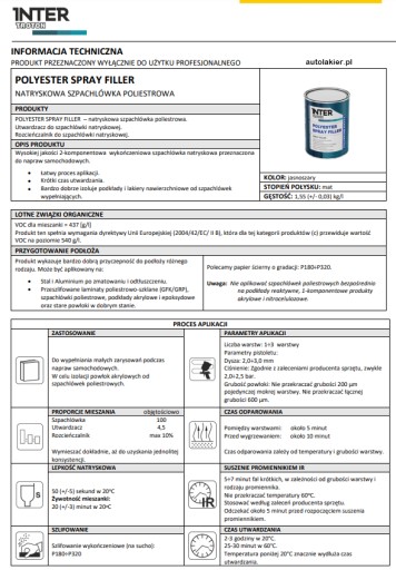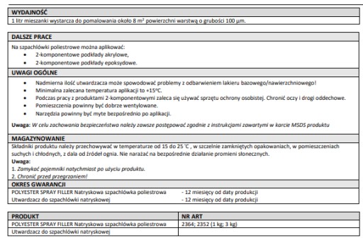 Uwaga: Nie aplikować szpachlówek poliestrowych bezpośrednio na podkłady reaktywne, 1-komponentowe produkty akrylowe i nitrocelulozowe.