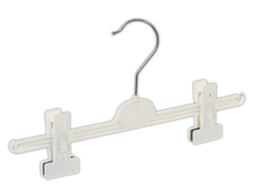 Wieszak klamrowy nazywany również spódnicowym o długości całkowitej ok. 40 cm. Klamerki mają bardzo mocny docisk co ułatwia solidne trzymanie się ubrania na wieszaku. Pod klamerkami znajdują się gumowe obicia dzięki którym odzież nie jest niszczona i nie zsuwa się z wieszaka. Na końcach wieszaka są specjalne nacięcia ułatwiające zawieszanie ubrań.