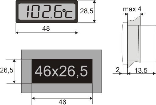 Termometr elektroniczny z wyświetlaczem LCD. Zasilany z dwóch baterii LR44. Zaopatrzone są w zintegrowany czujnik temperatury PTC o wysokiej dokładności i długości 1,5m. Montowany w tablicy na zatrzask. Model wyższej jakości i dokładności od podstawowych modeli termometrów tablicowych, cieszący się dużą popularnością i niezawodnością.