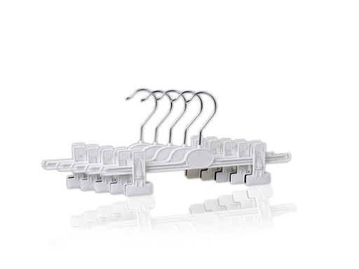 Wieszak klamrowy nazywany również spódnicowym o długości całkowitej ok. 32 cm. Klamerki mają bardzo mocny docisk co ułatwia solidne trzymanie się ubrania na wieszaku. Pod klamerkami znajdują się gumowe obicia dzięki którym odzież nie jest niszczona i nie zsuwa się z wieszaka. Na końcach wieszaka są specjalne nacięcia ułatwiające zawieszanie ubrań.