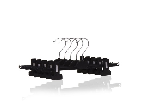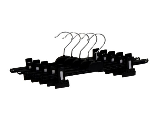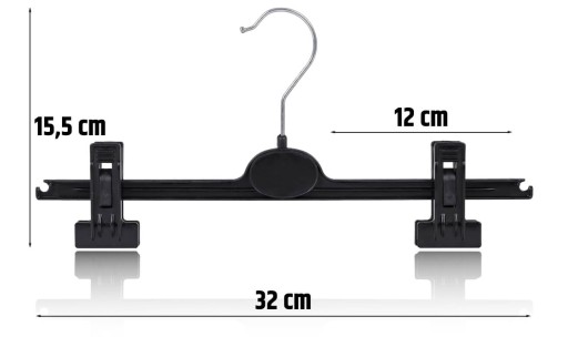 Przedmiotem sprzedaży jest 1 komplet ( 25 szt.) wieszaków klamrowych w kolorze czarnym o szerokości ok. 32 cm. Wieszak stworzony z dbałością o detale. Wzmocniona konstrukcja zapobiega pękaniu. Zawieszanie spódnic oraz spodni zdecydowanie pewniejsze, dzięki specjalnych elementów antypoślizgowych.