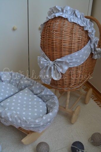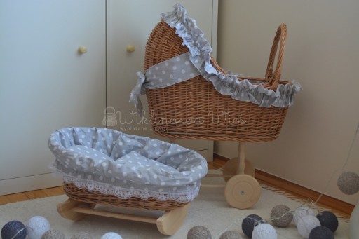 WIKLINOWY KOMPLET : PREMIUM WÓZEK DLA LALEK + KOŁYSKA SZARE GROSZKI