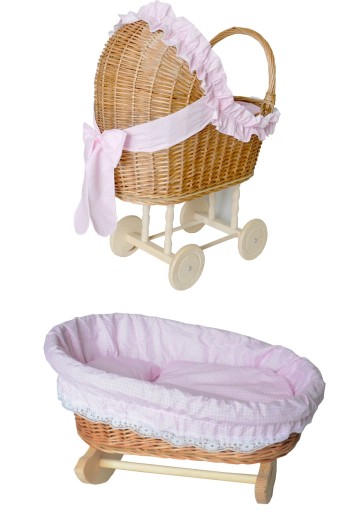 WIKLINOWY KOMPLET : PREMIUM WÓZEK DLA LALEK + KOŁYSKA RÓŻOWA KRATKA