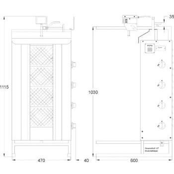 Pionowy opiekacz gazowy GD-4 niemieckiej marki POTIS o jednorazowym wsadzie do 70 kg. Maksymalna wysokość bloku mięsa 63 cm. Przeznaczony jest do przyrządzania dużych sztuk mięsa, zwłaszcza specjalności kuchni greckiej – gyrosa. Wykonanie - stal nierdzewna.