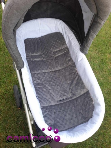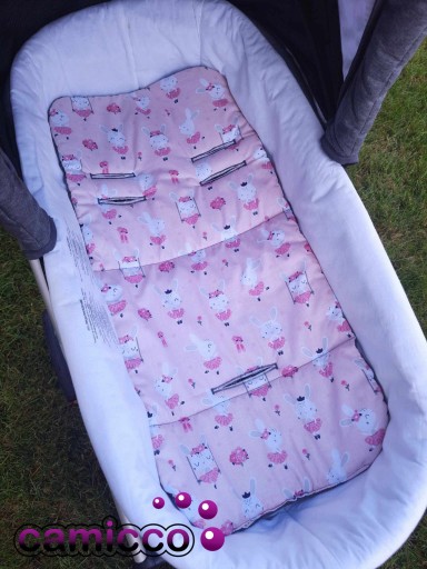 Materacyk pasuje do większości wózków dostępnych na rynku, posiada specjalne otwory na górne pasy bezpieczeństwa oraz na pas krokowy