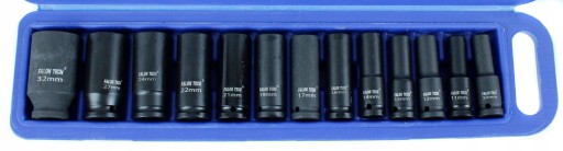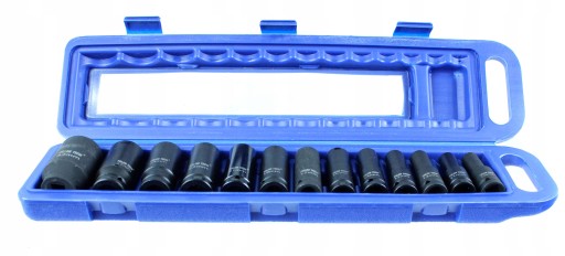 Komplet 13 szt. sześciokątnych nasadek udarowych 1/2" 10-32 mm przeznaczony do kluczy pneumatycznych oraz elektrycznych z udarem.