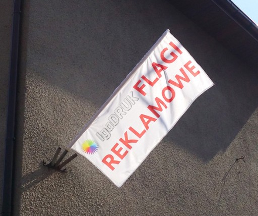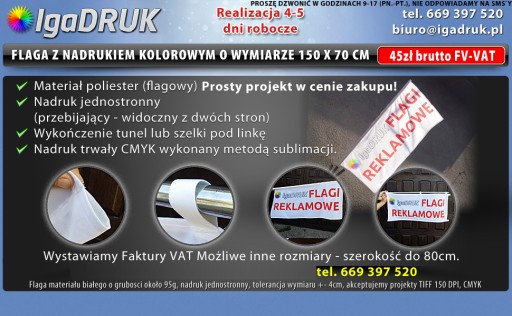 Maksymalna szerokość flagi to 80cm, długość dowolna, możliwe wykończenia - tunel, lub taśma co 50cm.