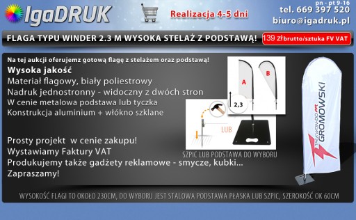 NA TEJ AUKCJI OFERUJEMY FLAGĘ TYPU WINDER Z STELAŻEM PODSTAWĄ LUB SZPICEM DO WYBORU (GOTOWA FLAGA DO POSTAWIENIA, NIE TRZEBA NIC WIECEJ DOKUPYWAĆ). TYP SZYCIA A LUB B , WYSOKOSC OKOLO 2,3 M.