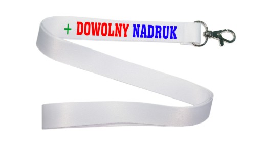 - Smycz reklamowa o szerokości 20mm, taśma biała + nadruk jednostronnym (CMYK) jeden wzór