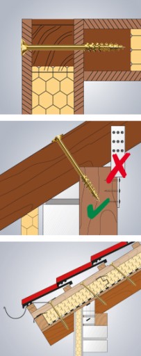 - Mocowanie krokwi. Przy pomocy wkrętów z główką talerzową można dociągać nawet silnie odkształcone krokwie