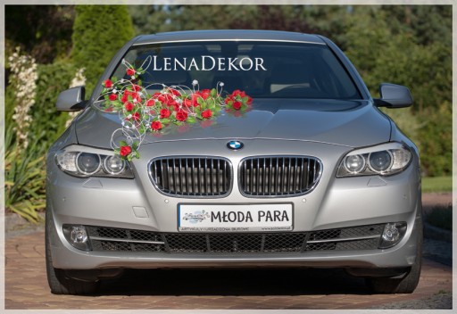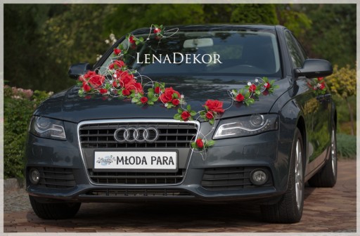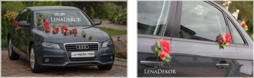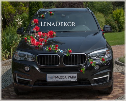 Przybranie na samochód ROSA. Kompozycja wykonana z trzydziestu sześciu sztucznych róż w kolorze czerwonym. Szczególnego charakteru nadają dekoracji małe białe kwiatki umieszczone na ozdobnych stroikach z rattanu.