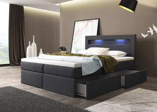Kompletne łóżko kontynentalne OSKAR z materacami sprężynowymi, z zagłowiem z oświetleniem LED oraz dodatkowym materacem nawierzchniowym. Podstawa łóżka wykonana jest z pojemnymi pojemnikami na pościel.
