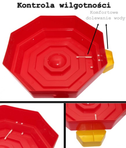 Na zewnątrz obudowy znajduje się specjalny pojemnik na wodę, który ułatwia uzupełnianie kanalików wewnątrz komory lęgowej inkubatora.