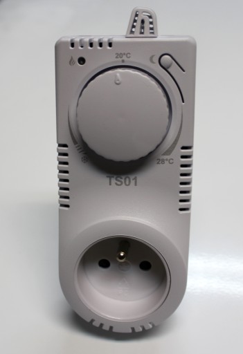 TERMOSTAT ELEKTROBOCK TS01 to prosty gniazdkowy regulator temperatury bez programatora tygodniowego do elektrycznych urządzeń grzewczych. Posiada on wbudowany czujnik temperatury powietrza. Stosowany jest do paneli grzewczych na podczerwień i innych grzejników elektrycznych. Termostat jest prosty w montażu. Wystarczy włożyć termostat do kontaktu i wpiąć wtyczkę panelu grzewczego. Termostat posiada dodatkową prostą funkcje obniżenia temperatury na okres nocny (8 godzin) o 3*C. Naciśniecie przycisku (noc) programuje termostat na dobowy cykl grzewczy z obniżeniem temperatury na 8 godzin. Zmiana temperatury na pokrętle powoduje zresetowanie cykli grzewczych..