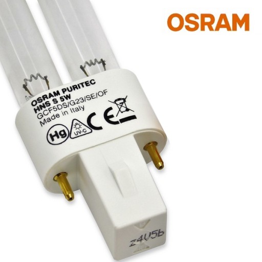 Promiennik nadfioletu Osram Puritec HNS G23 o mocy 5W, o wyglądzie świetlówki kompaktowej, z 2-pinowym trzonkiem G23.