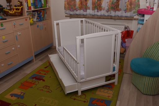 Łóżeczko wykonane jest z drewna sosnowego I gatunku, z możliwością zamiany na tapczanik dla starszego dziecka poprzez wymontowanie boku i zamontowaniu "drabinki" zabezpieczającej (drabinka zabezpieczająca w zestawie), natomiast szczyty i szuflada z płyty meblowej, pokryte nietoksycznymi farbami i lakierami posiadającymi atest.