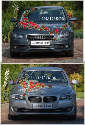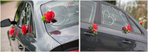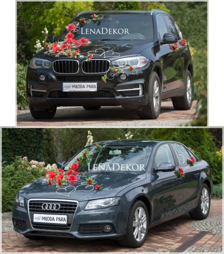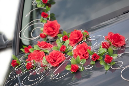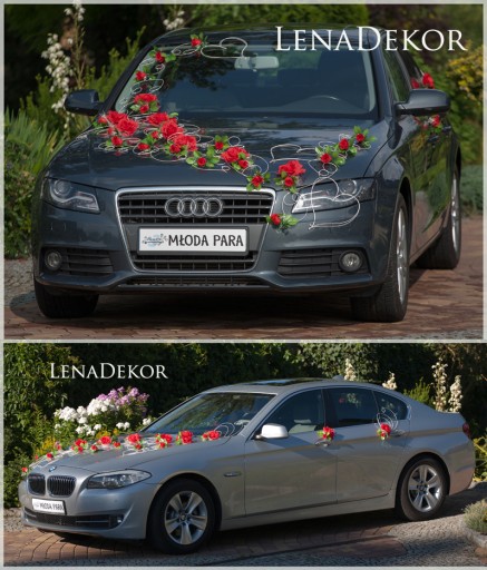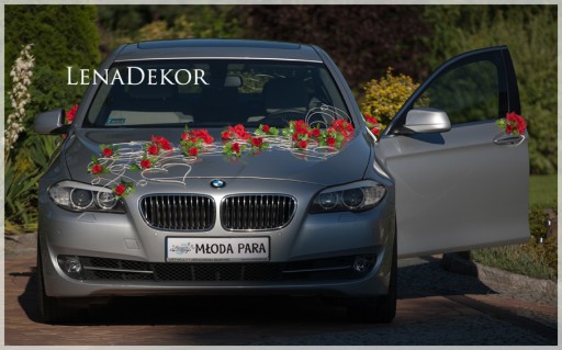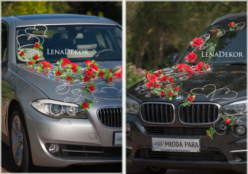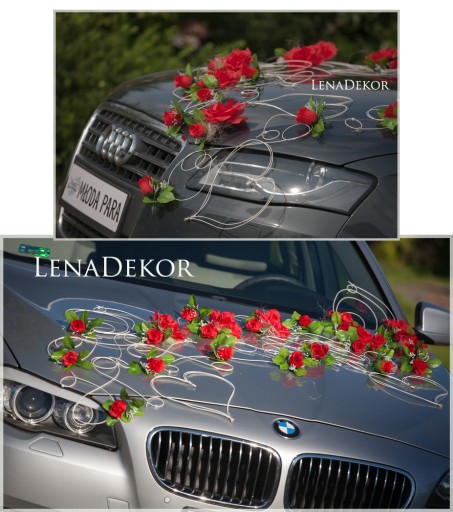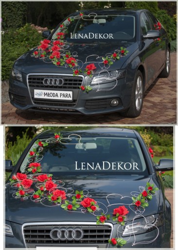 Dekoracja ślubna na samochód POLA to ozdoba wykonana z trzydziestu sześciu sztucznych róż. Zestaw bardzo bogaty i efektowny. Tutaj dostępny w kolorze czerwonym. Kolor biały, kremowy oraz różowy dostępne na naszych innych aukcjach.