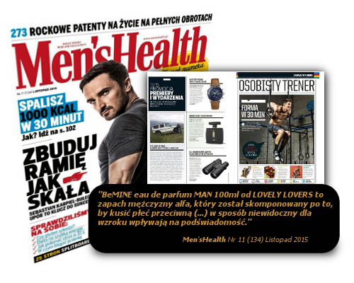 Działanie perfum z feromonami zapachowymi BeMINE zostało docenione przez redakcję magazynu Men'sHealth. Przyznane wyróżnienie oraz pełną recenzję perfum możesz zobaczyć w listopadowym numerze 11/2015. Artykuł "BĘDZIESZ KUSIĆ JĄ FEROMONAMI" z 96str. zobaczysz klikając w poniższy obrazek lub link: