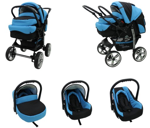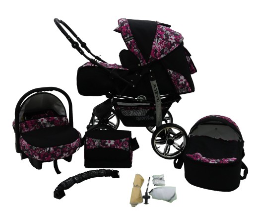 z przekładaną rączką do prowadzenia i fotelikiem samochodowym.
