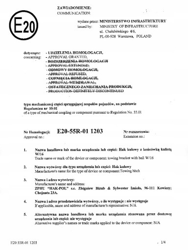 -> HOMOLOGACJA E20 potrzebna do zarejestrowania haka