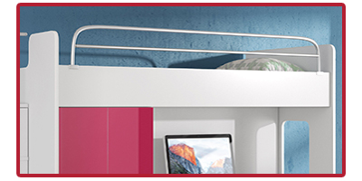 Korpus łóżka jest wykonany z odpornej na zarysowania płyty laminowanej w kolorze białym o grubości 16 mm. Barierka górna jest na całej długości łóżka.