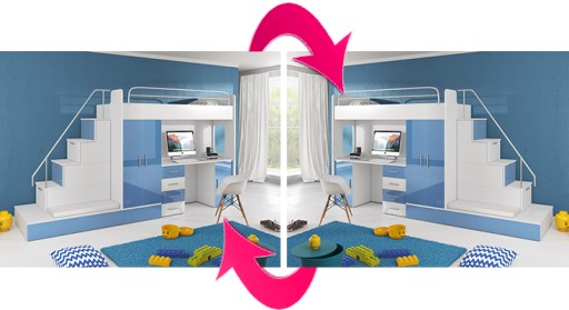 Łóżko może być złożone w wersji ze schodkami z prawej lub z lewej strony!