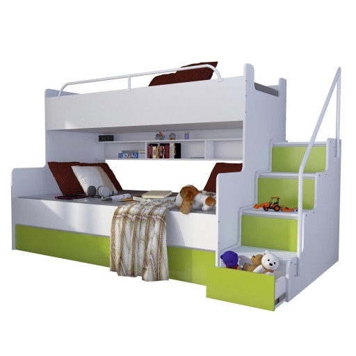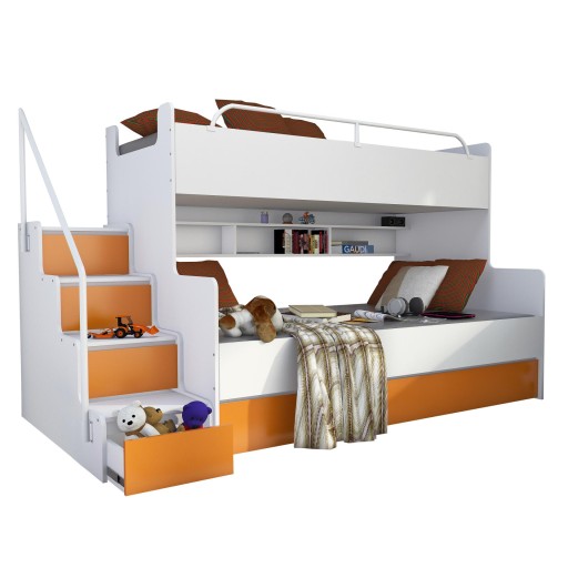 - Schodki z boku łóżka pełnią funkcję pojemników, które wysuwa się na prowadnicach rolkowych,