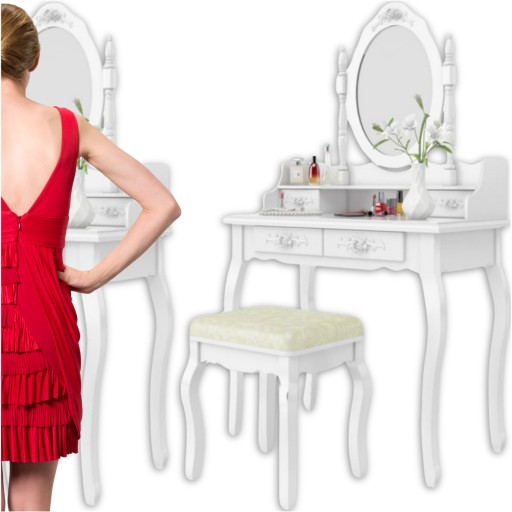 Niepowtarzalna toaletka kosmetyczna ze stołkiem i z dużym lustrem.Toaletka jest ręcznie wykonana, stołek zrobiony jest w wiktoriańskim stylu.Toaletka posiada zaokrąglone nogi i unikalne zdobienia wykonane z niebywałą precyzją.Cztery szuflady pomieszczą bardzo dużą ilość art. kosmteycznych.