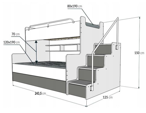 - Dolne łóżko: 120x190 cm (przeznaczone nawet dla dwóch osób)