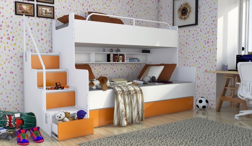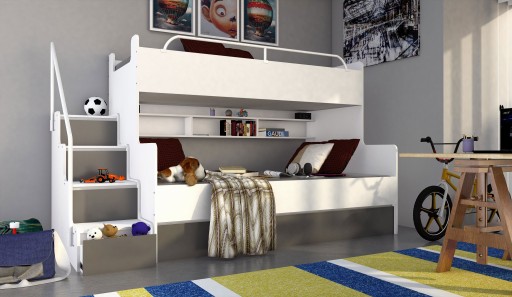 - Schodki z boku łóżka pełnią funkcję pojemników, które wysuwa się na prowadnicach rolkowych,