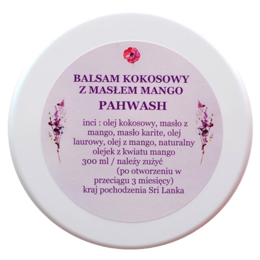 INCI: olej kokosowy, masło z mango, masło karite, olej laurowy, olej z mango, naturalny olejek z kwiatu mango