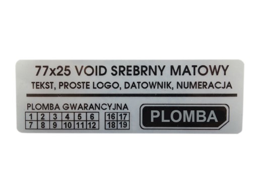 Oferujemy wykonanie 250 sztuk plomb gwarancyjnych w rozmiarze 77x25mm, z srebrnej matowej folii VOID.