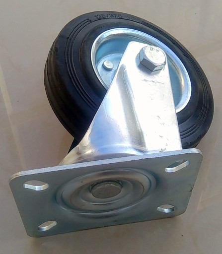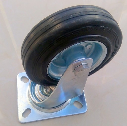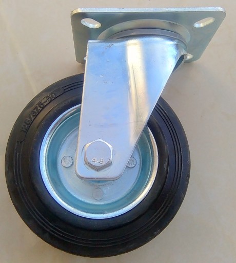 Koła mocowane na tzw. płytkę są połączeniem widelca wykonanego z tłoczonej blachy stalowej oraz koła z piastą stalową i oponką z pełnej, czarnej gumy. Głowica skrętna widelca jest podwójnie ułożyskowana oraz jest zabezpieczona przed zabrudzeniem specjalnym uszczelnieniem przeciwpyłowym.Wszystkie elementy metalowe zestawu pokryte są antykorozyjną powłoką chromowo-cynkową. Hamulec blokuje koło i głowice.